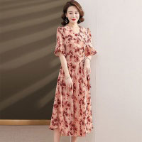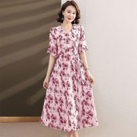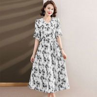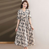 雪紡面料輕如羽 透氣不悶膚若雲 水墨印花繪詩意 喇叭袖柔滑 收腰貼合 長裙垂墜夏日舒爽美