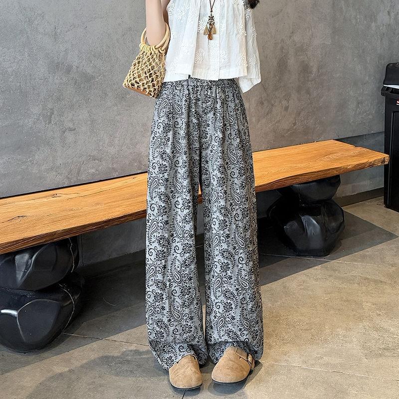 複古印花休閒褲 高腰線 闊腿褲型 輕鬆拉長腿部線條 小短腿秒變大長腿
