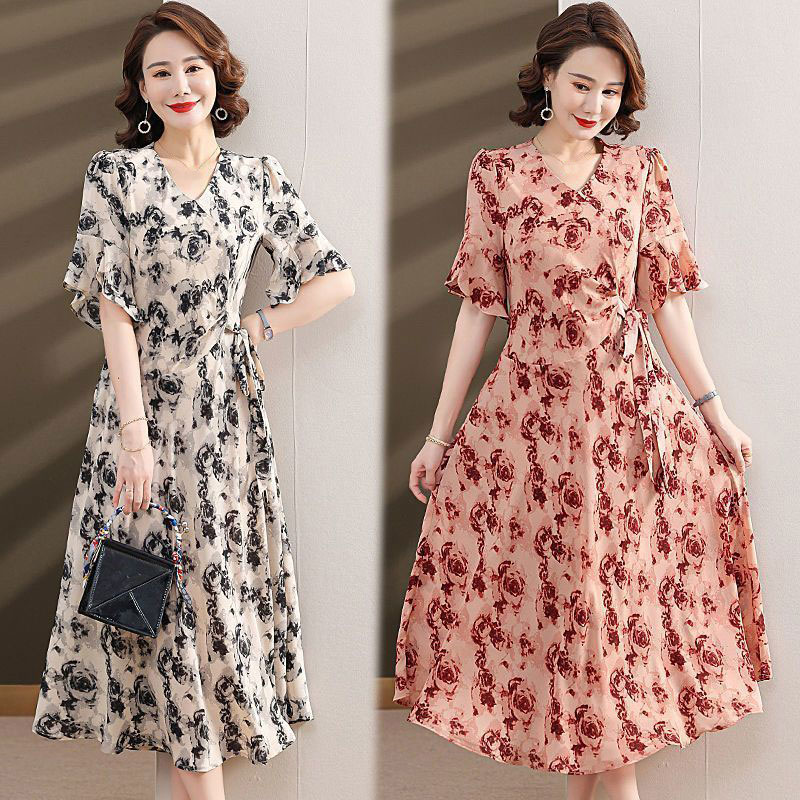 雪紡面料輕如羽 透氣不悶膚若雲 水墨印花繪詩意 喇叭袖柔滑 收腰貼合 長裙垂墜夏日舒爽美